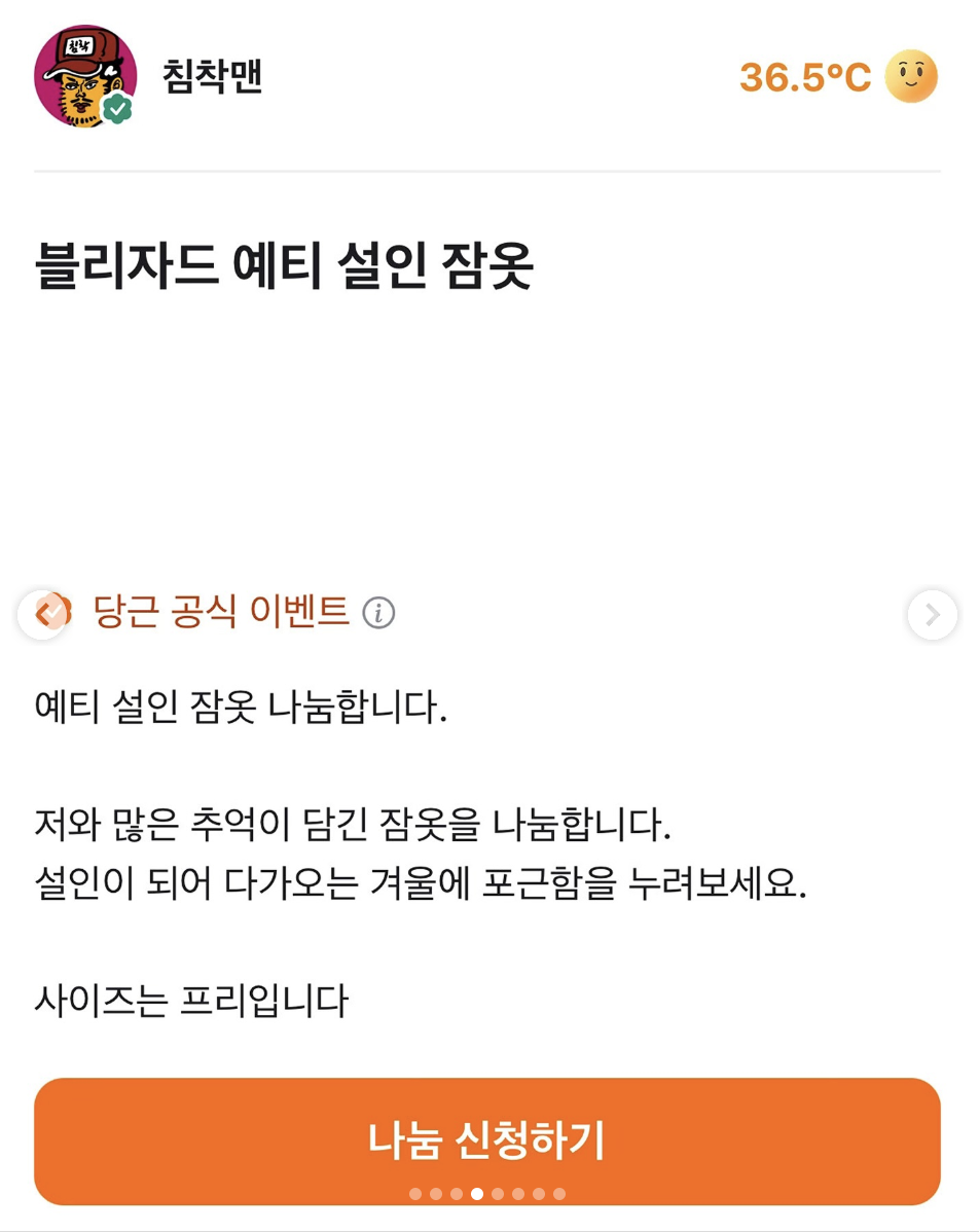 유튜버 침착맨이 실제 방송에서 착용하거나 사용했던 물품을 팬들에게 나눔하는 이벤트입니다. 나눔 받고 싶은 물건을 선택해 신청 메시지를 남기면, 추첨을 통해 당첨자에게 무료로 나눠주는 것이죠. 실제 당근 중고 거래 내 '나눔'이 활발하게 이뤄지고 있다는 점을 감각적으로 보여주는 좋은 기획 같았어요.