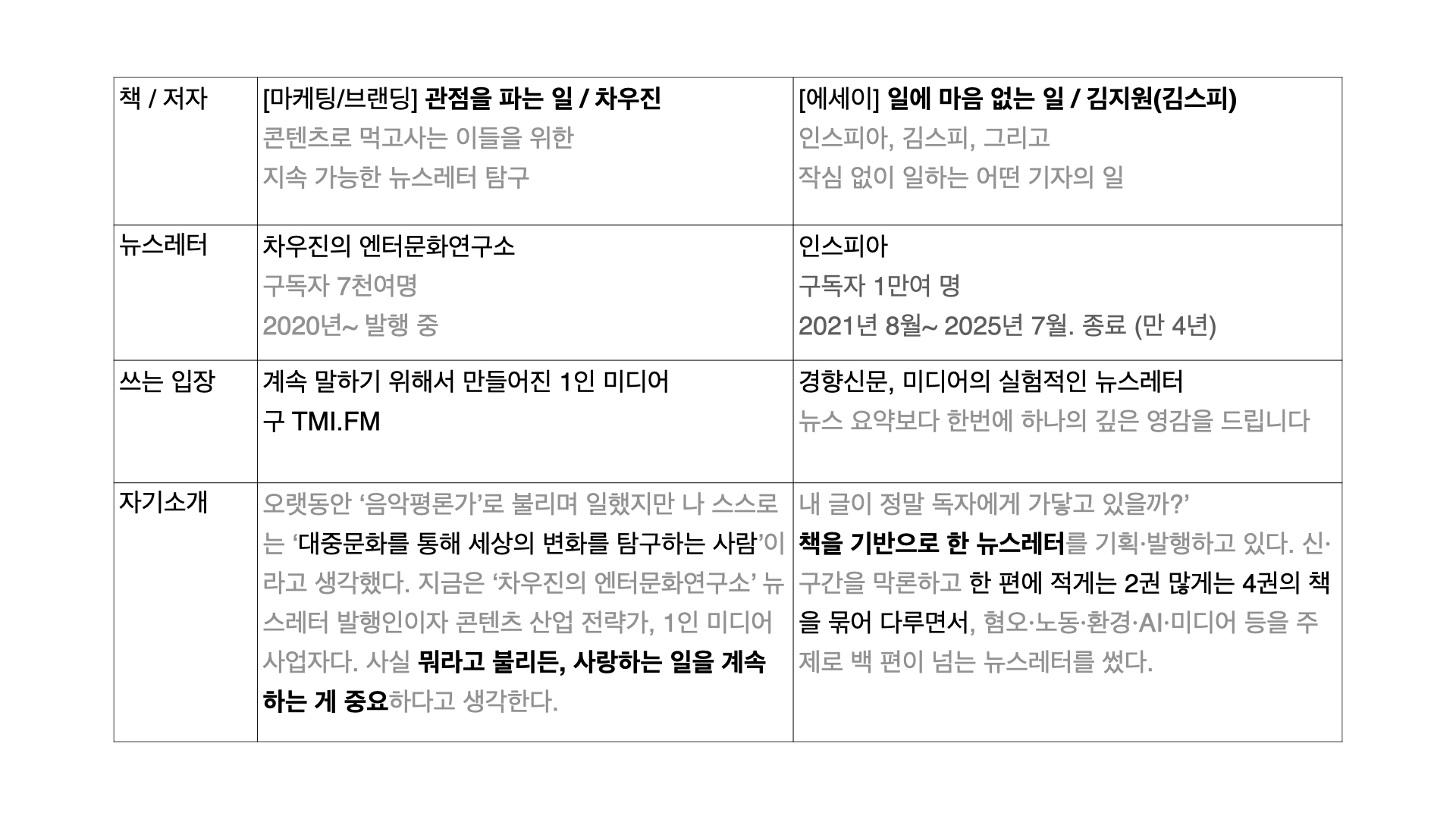 『관점을 파는 일』(2025, 유유)의 저자 차우진 그리고 『일에 마음이 없는 일』(2025, 흐름출판)의 저자 김지원. 두 사람은 각각 <차우진의 엔터문화연구소>, <인스피아>라는 뉴스레터를 지속해서 발행해왔습니다.